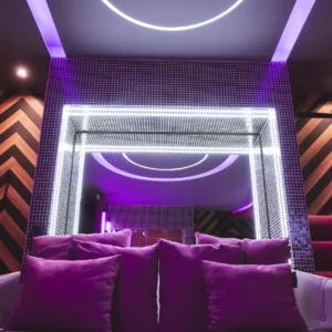 El espacio está dominado por una espectacular estructura central revestida de mosaicos brillantes, que enmarca la habitación con un juego de luces y reflejos infinito. Relájate en la amplia cama rodeada de cojines de terciopelo y descubre los rincones secretos que ofrece esta suite, incluyendo una zona lateral con niveles acolchados diseñada para la creatividad y el confort. Es el escenario perfecto para una noche donde el lujo y la fantasía se encuentran.