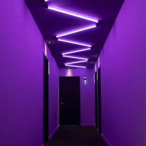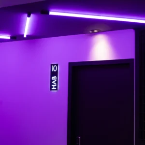 Bajo un techo de anillos de luz futuristas, la habitación te invita a explorar. Destaca por su “portal” de luz: un marco rectangular de espejos y mosaicos que añade profundidad y un toque glam a la estancia. Además de la cama principal, esta suite cuenta con una estructura lateral de escalones acolchados, ideal para experimentar nuevas formas de descanso y diversión. Todo envuelto en una acústica impecable y la mejor tecnología de entretenimiento.